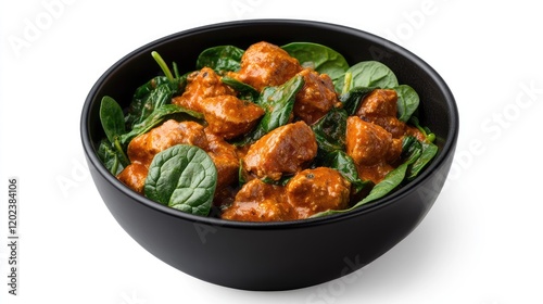 Chicken tikka masala with spinach in a black bowl isolated on a white background