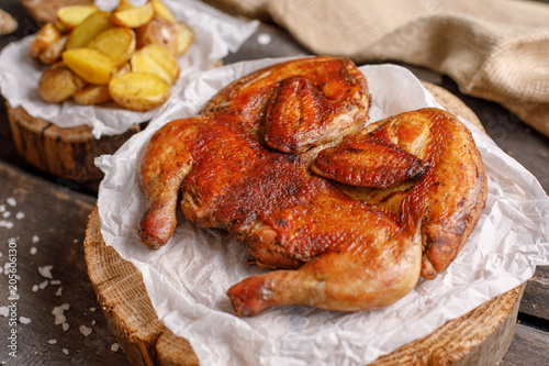 Chicken tobacco and potato garnish on wooden spilah. Close-up.