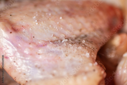 Chicken wings in a bowl sprinkled with coarse salt and black pepper. The wings appear fresh and are ready for marination. The seasoning. Preparation for cooking. Hight quality photo