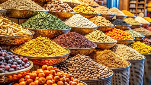 Chickpea and other dried food products on display at an Arab street market stall, Chickpeas, dried food, market stall, Arab