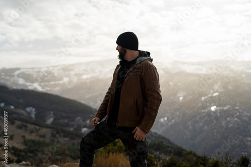 Chico joven con barba muy alto en la montaña con ropa marron y con montañas nevadas de fondo