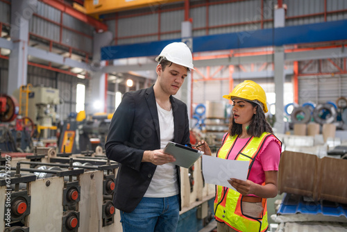 Chief Engineer and Project Manager Wearing Safety Vests and Hard Hats, Use Digital Tablet Computer in Modern Factory, Talking and planning optimization of production at industrial factory.