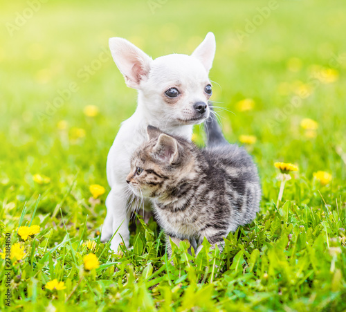 Chihuahua puppy and a kitten standing together on a dandelion field
