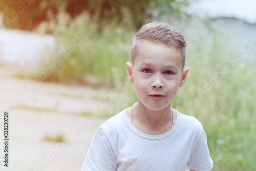 child boy 6 years old in a white T-shirt and fashionable hairstyle on the street in summer
