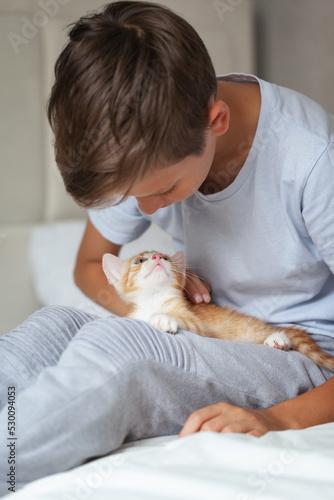 Child boy and a ginger kitten look at each other while sitting on the bed at home. Kid and fluffy pet. Domestic animals concept. Friendship between kids and pets.