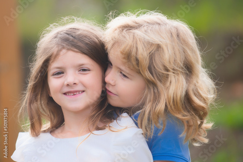 Child boy and girl hugging each other with love in the spring garden. Two little kids hugging in the park. Kids friends playing together outdoor. Little girl kissing little boy outdoors in park.