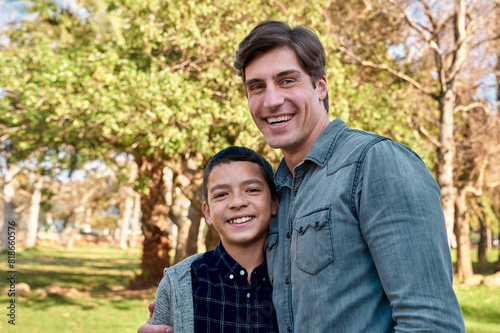 Child, boy and hug father in park with love, support and happy for reunion or play outdoor. Family, dad and kid bonding together in portrait for security, care and childhood with growth in nature