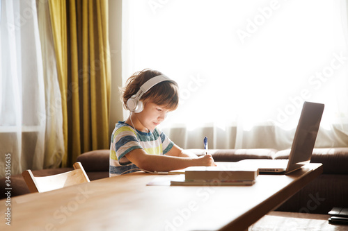 child boy in earphones is using a laptop and study online at home. homeschooling, distant learning