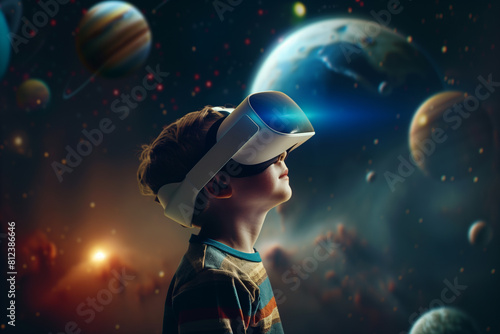 Child boy wearing virtual reality headset and looking solar system with sun and planets. Technology concept.