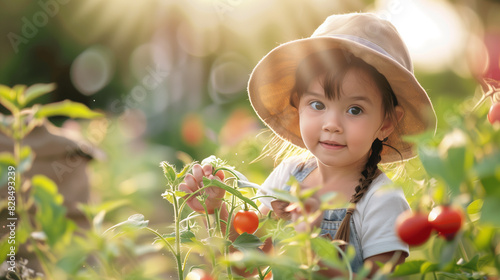 child collects cherry tomatoes. Kid in garden experience, 4 year old girl in gardener's clothes in garden with cherry tomatoes beautiful bokeh. girl is smiling in a summer hat and denim overalls