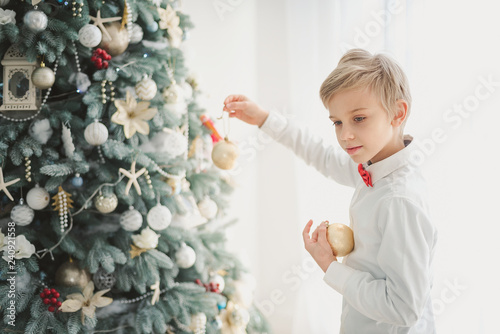 Child decorating Christmas tree at home. Boy hangs Christmas balls on tree. Christmas Eve concept.
