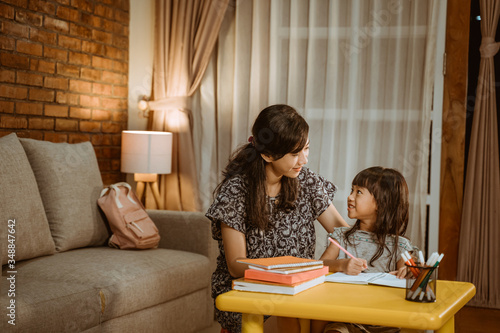child do homework at home in the evening. mother help her daughter to study
