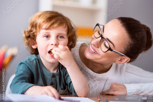 Child eating and mother looking at him