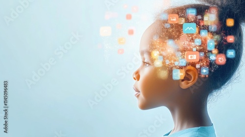 Child engaged in digital media with colorful app icons representing technology and imagination