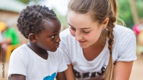 Child Engaging in Language Learning Activities with Volunteer Mentor