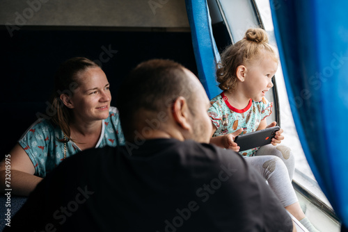 Child Engrossed in Mobile Game with Parents on Ferry Ride