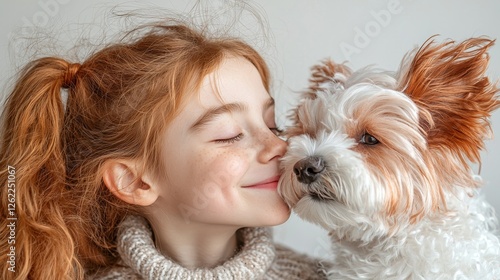 Child enjoying cotton candy with puppy outdoor fair joyful moment bright environment close-up view childhood delight