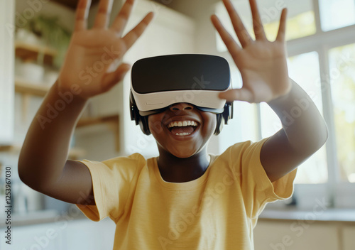 Child enjoying virtual reality gaming experience with vr glasses in a playful setting