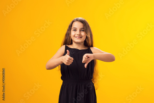 Child girl showing thumb up and thumb down gesture. Positive and negative emotions concept