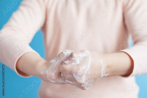 Child girl washing hands with soap on a blue background. Hand disinfection. Epidemic Covid-19.