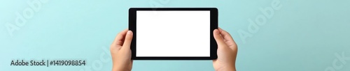 Child hands holding a blank digital tablet against light blue background for technology and education design