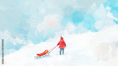 Child in Red Coat Pulling Sled Through Snowy Landscape with Soft Blue Background