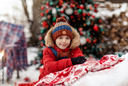 Child in red winter outerwear outdoors in snow looking at camera. New Year Christmas holiday. Happy kid playing with snow outdoor. New year tree and presents Snowflakes and colorful winter clothes