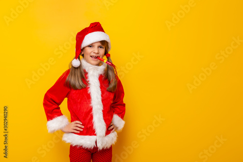 Child in Santa costume blowing party whistle