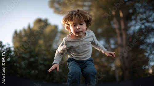 Child jumping on a trampoline in the garden.