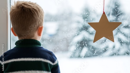 Child looking out a frosted window with a handmade cardboard star ornament hanging nearby, a sense of hope