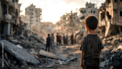 Child Observes War-Torn City Rubble Amid Destruction with Hope in Background