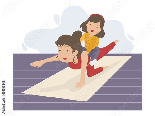 Child playing on mother's back while she's doing yoga exercise, playful kid ride mommy's back