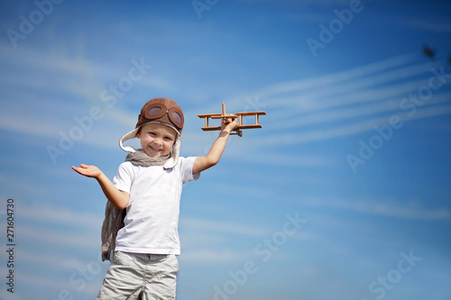 Child playing with wooden airplane toy, boy imagines discovery adventure