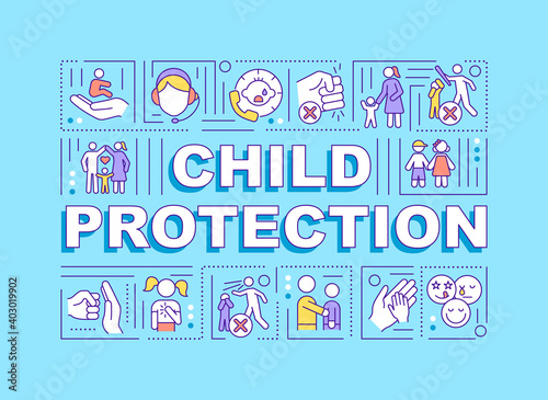 Child protection word concepts banner. Save kids from domestic violence. Infographics with linear icons on turquoise background. Isolated typography. Vector outline RGB color illustration