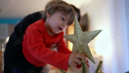 Child putting Christmas star on top of tree. Mother holding little boy helping to put winter season decoration festivities. December Celebration