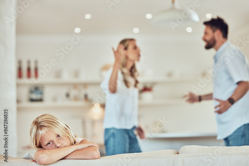 Child, sad portrait and parents fighting in home with anxiety, marriage fail and childhood trauma. Depressed girl, mom and dad with argument in lounge for divorce, infidelity crisis and mental health