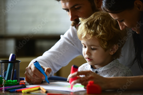 Child son with father and mother drawing . Family holiday and togetherness. Mom, dad and child boy, holiday and togetherness. Kid learning painting, little artist painting, drawing.