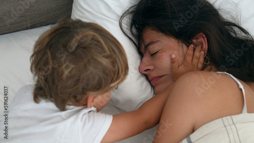 Child waking up mother laying in bed in the morning. Authentic real life family lifestyle moment. Little boy son wakes up mom