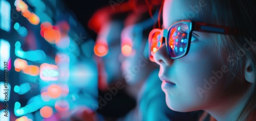 Child wearing colorful glasses, focused on vibrant screen lights.