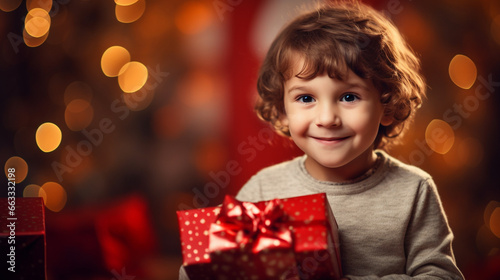child with a gift for the New Year, New Year's interior, Christmas atmosphere. Generative AI