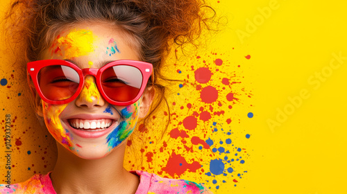 Child with paint on her face beams with happiness in a bright setting, enjoying a lively festival filled with colors