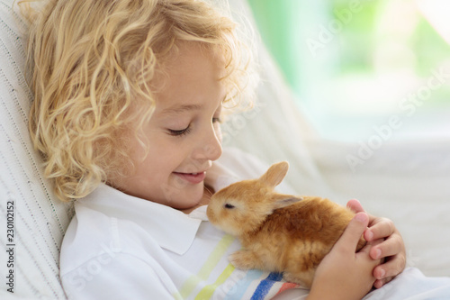 Child with rabbit. Easter bunny. Kids and pets.