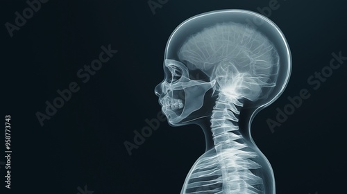 Child X-ray: A detailed x-ray of a child's head and spine, showcasing the intricate structure of the skeletal system. The image is rendered in a professional and medical style