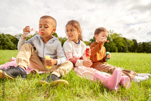 childhood, leisure and people concept - group of children blowing soap bubbles at park