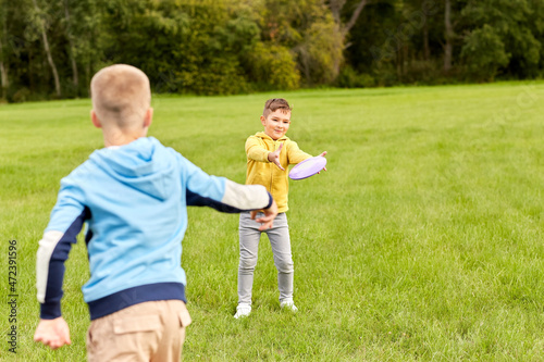 childhood, leisure and people concept - happy boys playing game with flying disc at park