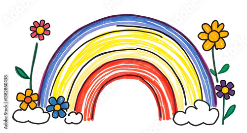 Childlike Rainbow Art, Playful Flower Illustration, Colorful Rainbow Drawing, Childish Sky Scene, Decorative Art, Modern Art Print, Whimsical Rainbow Pattern, Nature Drawing
