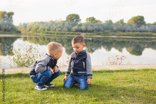 Children and nature concept - Two brothers sitting on the grass over nature background
