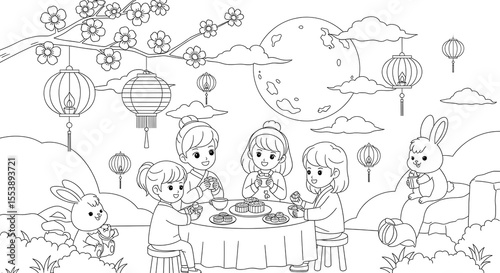 Children and rabbits celebrate moon festival with mooncakes and lanterns isolated on transparent background