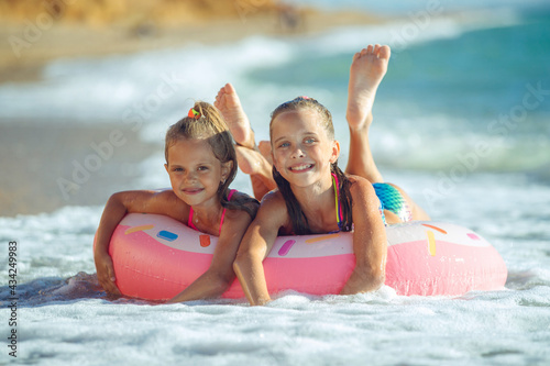 Children are playing on the beach. Children swim and play in the sea on summer family vacations. Sand and water activities. Two girls run on the ocean shore. High quality photo.