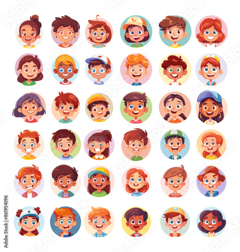 Children avatars cartoon vector set. Circles boys girls heads positive happy faces smile cute characters illustration isolated on white background